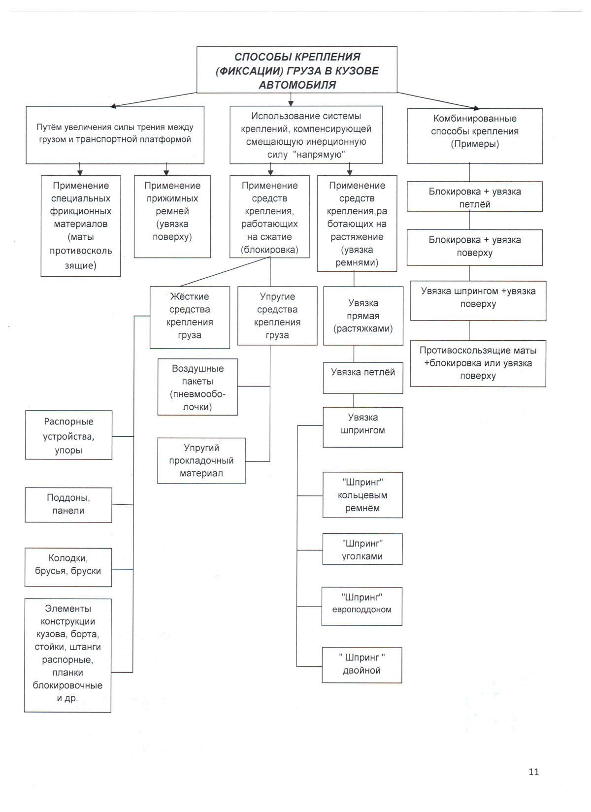 Все рассмотренные здесь способы крепления груза показаны на схеме "СПОСОБЫ КРЕПЛЕНИЯ (ФИКСАЦИИ) груза в кузове автомобиля" Схема позволяет быстрее определить средства и способы крепления груза. При выборе способа и средств, крепления необходимо учитывать следующее: массу и габариты груза, расположение центра тяжести груза, форму и тип груза, коэффициент трения, грузоподъёмность автомобиля, количество и расположение точек крепления на грузовой платформе и предельные их нагрузки, прочность бортов.
